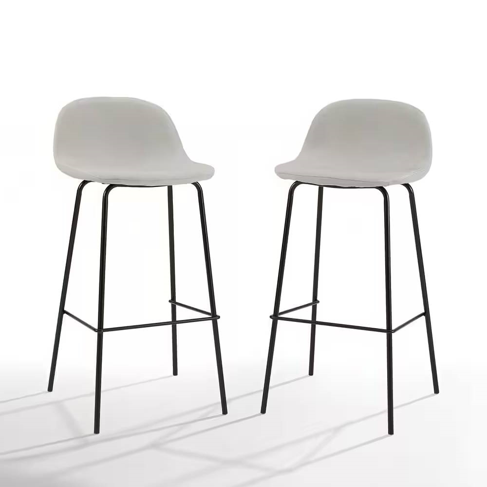 The Set of 2 - Modern Low Back Barstool with Black Metal Frame and Beige Linen Seat combines modern and industrial aesthetics, creating versatile seating for a kitchen or dining area. Featuring upholstered bucket style seats on tapered steel legs, these stools offer comfort and a sleek footprint. Pair the bar stools with a rustic bar height table or a contemporary breakfast bar for an instant dining upgrade.