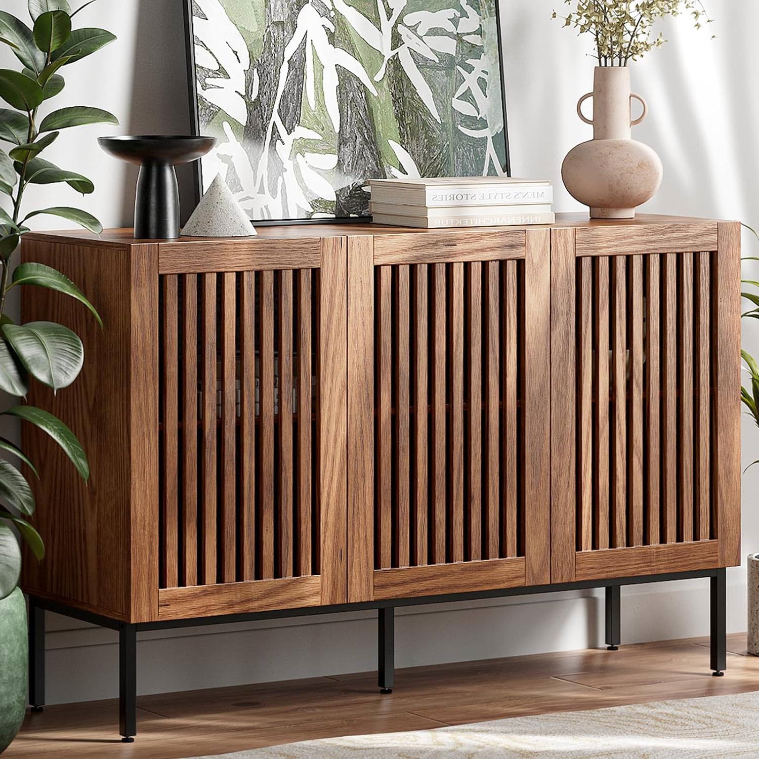 This Mid-Century Modern Dining Buffet Storage Cabinet Sideboard in Brown Wood Finish, adorned with grille-striped doors, embodies a unique design that effortlessly blends the rustic charm of the countryside with modern elegance. Not only a buffet cabinet but also an eye-catching storage sideboard. It serves as a captivating focal point in your living room, dining room, or office, adding a touch of style and functionality to any space. Boasting four spacious compartments and adjustable shelves, our storage cabinet offers ample room for all your belongings. Organize and stash away everything from books to clothes, toys to home decor, all while maintaining a tidy and stylish appearance. Brown accent cabinet whole is made of high-quality MDF wood, which is waterproof, scratch-resistant and wear-resistant. Metal legs is sturdy and stable, long-lasting construction and easy to clean. which is strong enough to stand the microwaves, mixers, blenders and even coffee machines. At the same time,it will separate the cabinet from the ground to prevent moisture. The Mid-Century Modern Dining Buffet Storage Cabinet Sideboard in Brown Wood Finish comes with the tools needed for installation and clear and concise instructions. You can quickly assemble in 20 minutes. Overall Dimensions: 47.2î(L) x 15.3î(W) x 31.5î(H).