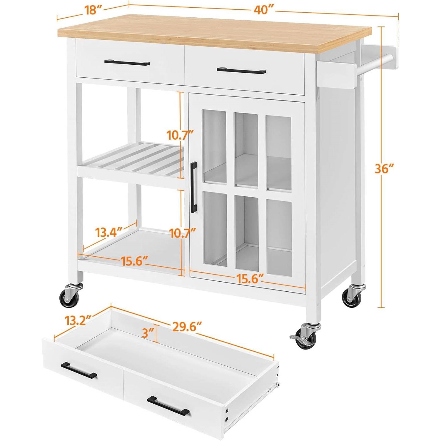 This White Kitchen Island Cart with Wood Top Storage Cabinet and Locking Casters is founded atop 4 caster wheels that provide must-have maneuverability. With a four-wheel base, it can go anywhere you need it and the 2 locking casters can keep it in place if needed. Measuring 91.5cm/36î long 45.5cm/18î wide, the bamboo countertop gives you extra elbow room as you prep, serve, and stow. And its varnished surface is easy to clean with a damp cloth. The transparent tempered glass door makes sure you can spot things you want inside the cabinet quickly. The interior shelf can be adjusted to three different heights to accommodate your storage needs. This kitchen island cart sports a classic finish for a neutral and elegant look and works well in both classic and contemporary kitchens. It also serves perfectly as a coffee bar or a place for cocktails when paired with counter-height stools. This kitchen island cart comes with step-by-step assembly instruction and numbered parts and hardware to make sure you can set it without difficulties. An Allen Key is also included for your convenience.