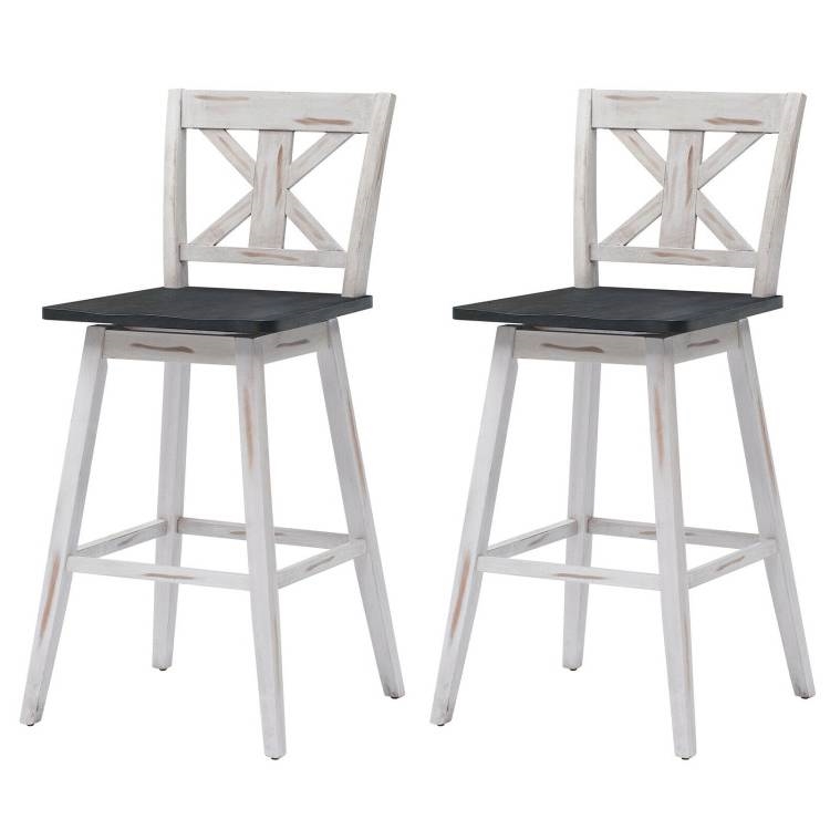 This Set of 2 White Wood 29-in Modern Kitchen Dining Farmhouse Swivel Seat Barstools is made of premium rubberwood and features excellent sturdiness and durability. Therefore, the overall weight capacity of each bar stool has been improved to 214 lbs and you can use the set for a long time. The backrest is designed to be ergonomic and can perfectly fit your back lines. Meanwhile, the seat of the barstool also adopts a curved design, fitting your hips. In this way, your body will be well supported and fatigue can be relieved. Even sitting for a long time you will not feel very tired. The special thing is that the seat is a 360‚àû swivel and you can spin quietly. Thanks to this feature, you can talk to your guests in different directions conveniently. Moreover, there are 2 bar stools in this set, which can meet your daily needs. In addition to your home kitchen, the bar stool set can also be placed in restaurants, bars, and bistros. Meanwhile, with a vintage design, the bar stools can also become a wonderful decoration. The set will bring a sense of fashion and freshness to your home. All needed manuals and accessories are included in the package. With these necessary tools, you can easily assemble the bar stool set. The overall dimension of each stool is 20" x 20" x 43" (L x W x H) and the seat is 29" high. During daily life, you only need to wipe it with a damp cloth regularly.