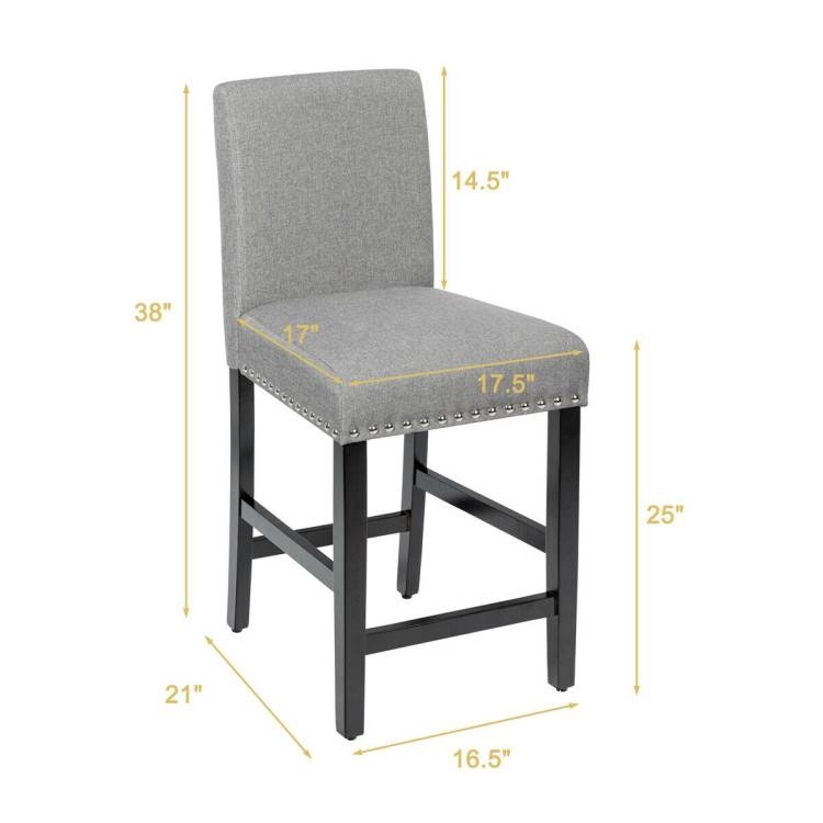 This Set of 2 Modern Kitchen Dining Barstools w/ Black Wood Legs and Grey Linen Seat would be a great addition to your home. The soft cushions of the backrest offer great softness, much more than ordinary bar stools. As well, the interior spring beneath the seat makes for great elasticity and support. The extra breathable linen fabric is amazingly durable and will provide lasting comfort. No matter how tall you are or how long your legs are, these barstool allow you to sit comfortably. The curved backrest is designed to alleviate back strain and provide extra support, while the wide seat is designed to cater to all manner of people ñ perfect for commercial as well as in-home use. The wood legs feature great sturdiness and enable these barstools to provide firm support. The 4 bars connecting the legs provide a footrest as well as adding to the structural integrity of the stools. Plus, there is no need to worry about any wobbling as the adjustable foot pads provide stability even on uneven floors. The various rivets around the seat add an aesthetic beauty to these bar stools. The stylish appearance makes these a perfect complement to either your dining table or kitchen counter. Use these bar stools to enjoy a drink or as dining chairs to entertain guests. The assembly process is a breeze for anyone thanks to the simple structure and easy-to-understand instructions. Requiring less time and effort, the assembly process is much easier than that of other bar stools. In addition, the solid construction provides great stability and a long life span.