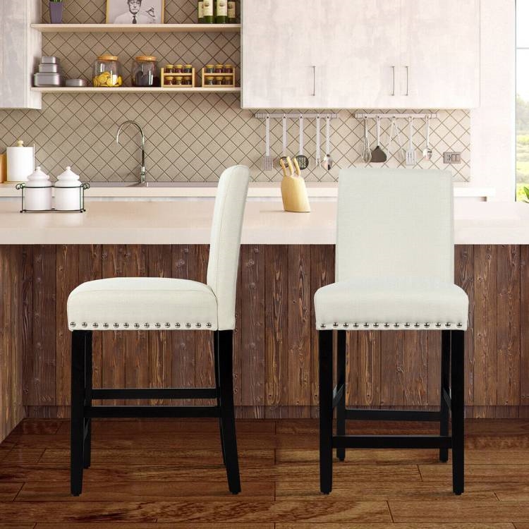 This Set of 2 Modern Kitchen Dining Barstools w/ Black Wood Legs and Beige Linen Seat would be a great addition to your home. The soft cushions of the backrest offer great softness, much more than ordinary bar stools. As well, the interior spring beneath the seat makes for great elasticity and support. The extra breathable linen fabric is amazingly durable and will provide lasting comfort. No matter how tall you are or how long your legs are, these barstool allow you to sit comfortably. The curved backrest is designed to alleviate back strain and provide extra support, while the wide seat is designed to cater to all manner of people ñ perfect for commercial as well as in-home use. The wood legs feature great sturdiness and enable these barstools to provide firm support. The 4 bars connecting the legs provide a footrest as well as adding to the structural integrity of the stools. Plus, there is no need to worry about any wobbling as the adjustable foot pads provide stability even on uneven floors. The various rivets around the seat add an aesthetic beauty to these bar stools. The stylish appearance makes these a perfect complement to either your dining table or kitchen counter. Use these bar stools to enjoy a drink or as dining chairs to entertain guests. The assembly process is a breeze for anyone thanks to the simple structure and easy-to-understand instructions. Requiring less time and effort, the assembly process is much easier than that of other bar stools. In addition, the solid construction provides great stability and a long life span.