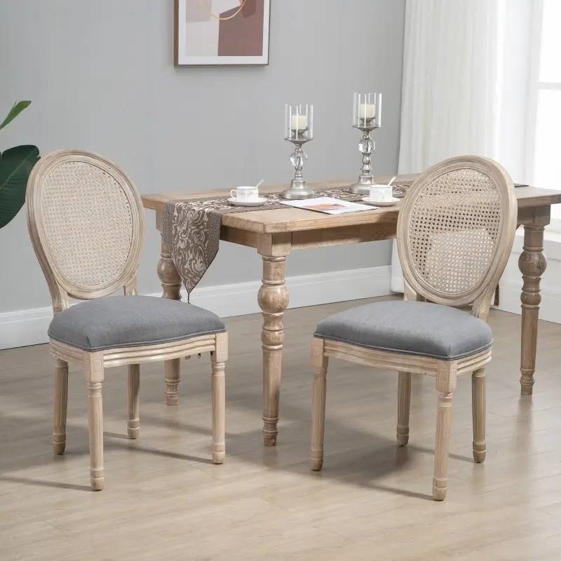 These Chic French Style Set of 2 Vintage Upholstered Armless Rattan Back Dining Chairs Grey Wash has an elegant and rustic style, gracefully curved back, classic color scheme, and beautifully carved leg patterns. These armless chairs have a rubberwood frame and legs, and linen fabric upholstery with a high-density sponge makes these modern dining chairs breathable and provides high comfort. The padded backrest supports your back and lumbar, while the armless design allows for multiple sitting options and freedom of movement while seated. These dining set chairs work great in your dining room, kitchen, or living room. The footpads on each leg ensure you won't scuff up your hardwood or tile floors and stay in place on the carpet.