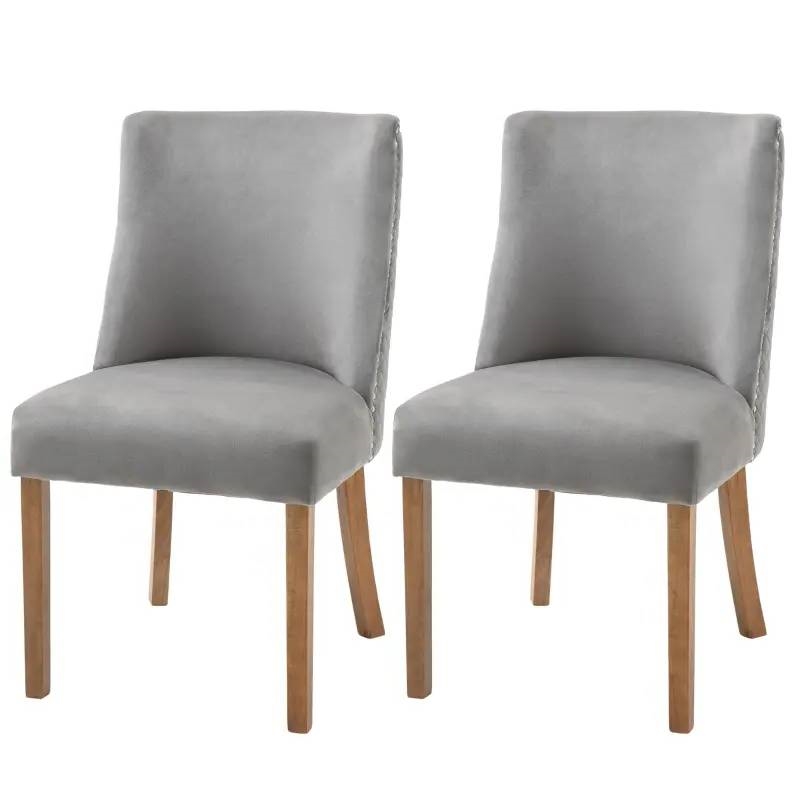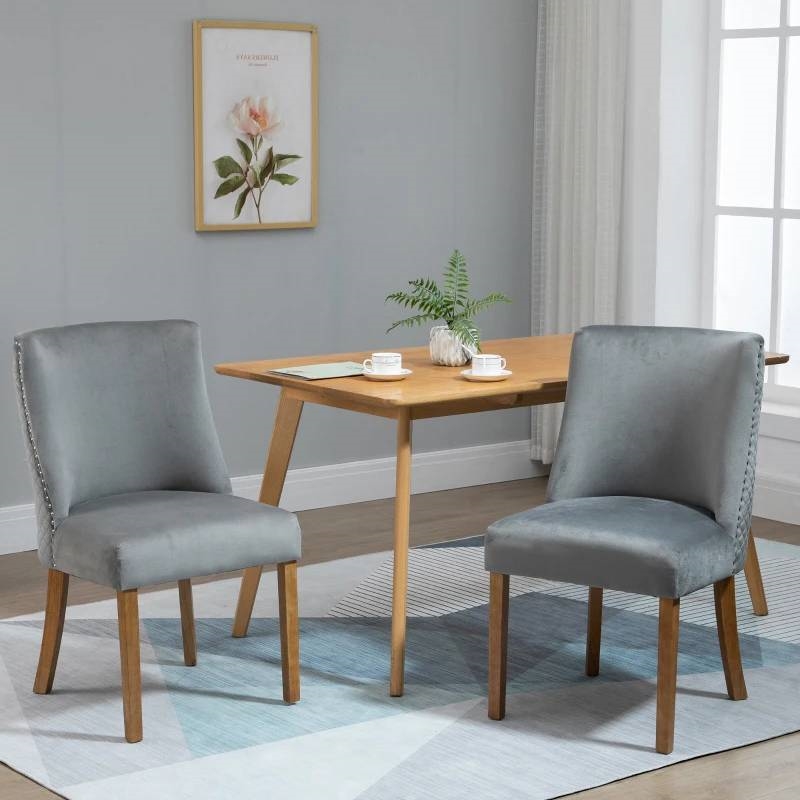 Create a stylish and cozy dining area with this Grey Modern High Back Nail Head Trim Upholstered Dining Chairs, Set of 2! Includes 2 chairs that can be used for having dinner, a conversation for two or accent chairs in your home. Chairs include a high backrest and wood legs for a modern and contemporary design that complements your home dÈcor. Use in the kitchen, dining room, bedroom, office, and more. Sit back and sink into these upholstered accent chairs! The chairs covered with velvet-touch polyester fabric offer good breathability. Includes a high back and a sponge padding seat for added comfort and support while you lounge. The dining room chairs are suitable for daily use. All four legs are made with solid wood construction for a stable seating area.