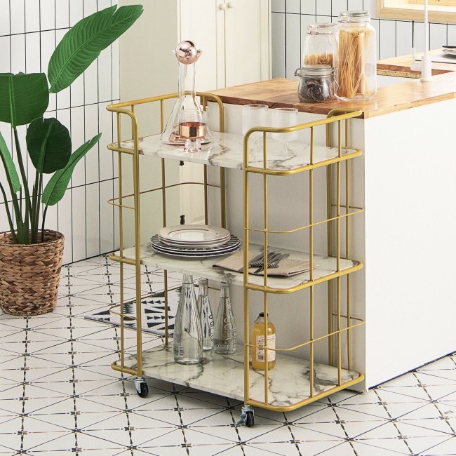 This 3 Tier Faux Marble Gold Rolling Bar Cart offers sufficient storage for food, wine, beverage, tableware and so on, which can well satisfy your storage needs. It's designed with beautiful gold frame and faux marble finish, which brings a touch of elegance to any room of your house. The kitchen utility cart is equipped with four 360‚àû swiveling casters for smooth rolling, including two casters with brakes. Made of rust-resistant steel and high-quality MDF, the serving cart is solid and durable. Each shelf can bear a weight up to 55 lbs.