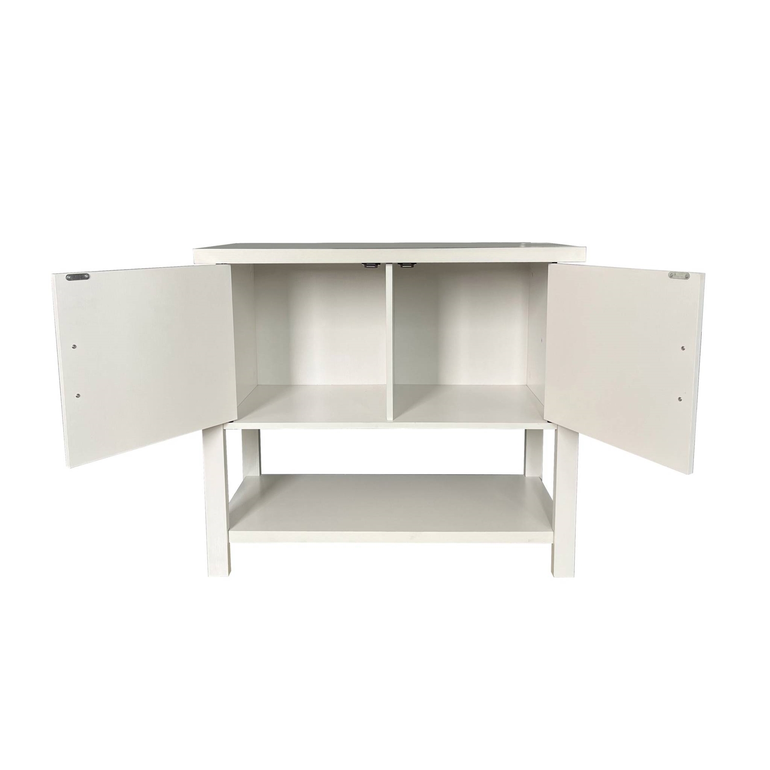 The Modern 2 Drawer Wooden Storage Console Table White brings classic style to your humble abode with a clean lined silhouette and open design lower shelf. This sturdy console is crafted from manufactured wood. It sports 2 cross panel fronted doors revealing 2 spacious interior cabinets ideal for stowing away larger necessities and keeping them out of sight while the accented metal door handles add a high-end and modern appeal.