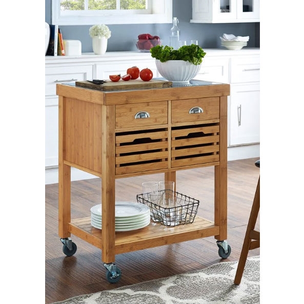 Add storage space and modern style to your kitchen with this Stainless Steel Top Bamboo Wood Kitchen Cart with Casters. Beautifully designed, this kitchen cart is crafted from solid bamboo with a stainless steel inset and a natural bamboo finish, which complements a variety of decors. Two pull-out drawers and two pull-out baskets provide ample storage space for utensils, kitchen gadgets, tea towels, and more, while the bottom shelf is perfect for larger kitchen items or a decorative piece. The castors on the bottom make it easy to maneuver this cart so you can keep it off to the side when not in use or wheel it into your kitchen when you need added counter space. This kitchen cart is CARB P2 compliant, and you'll love the simple elegance it brings to your home.