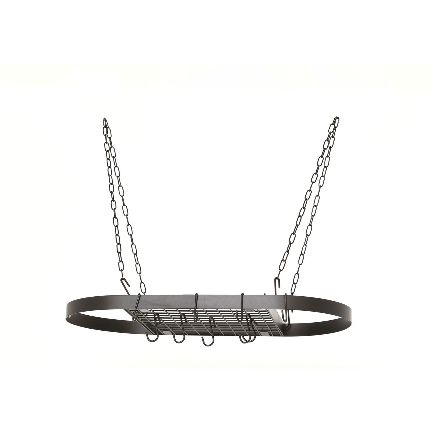 With a shelf for your larger kitchenware items and moveable hooks that are designed to stay in place when you add or remove pots and pans, this Oval Hanging Pot Rack with Chains and 2 Hooks in Matte Black is a great addition to any kitchen.
